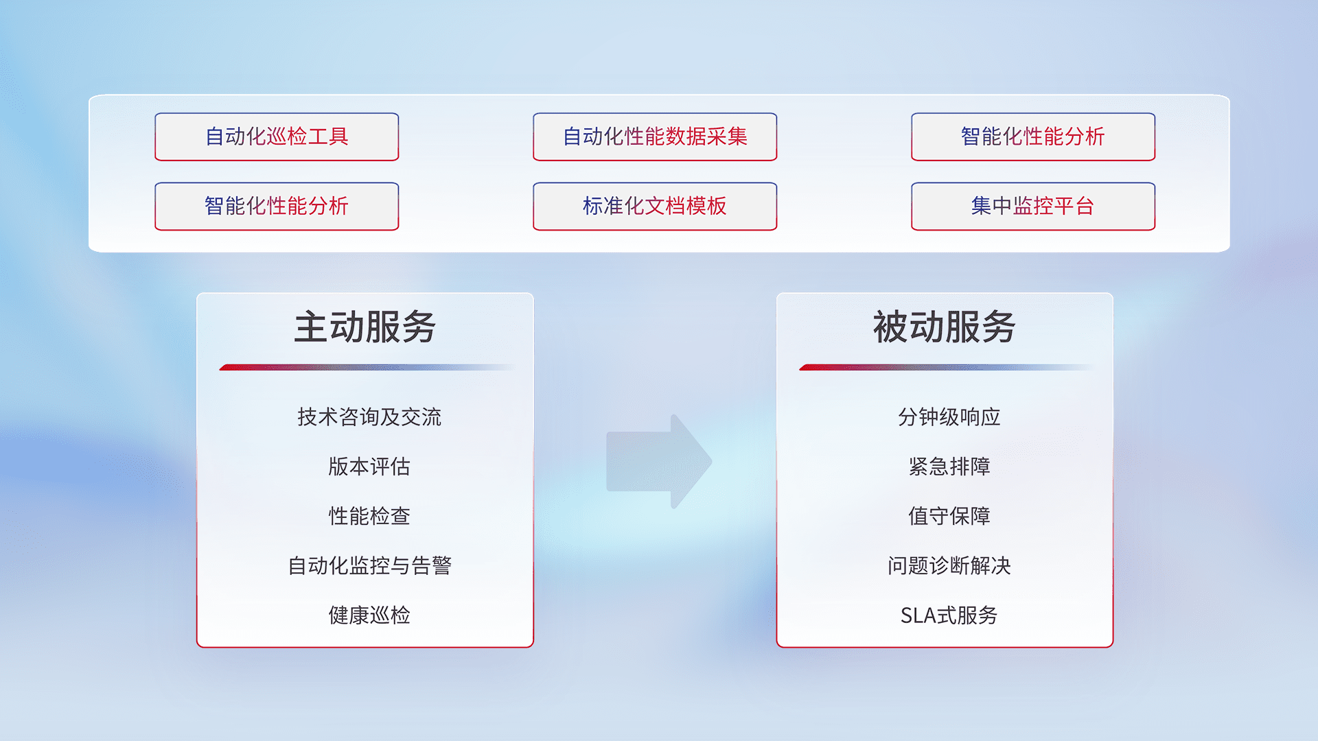 智能化工具和标准化文档,,保障服务质量,,,提供主动服务(包含技术咨询、、版本评估、、、性能检查、、、、自动化监控与告警、、健康巡检)和被动服务包含(分钟级响应、、、紧急排障、、值守保障、、、、问题诊断解决、、、、SLA服务)。。